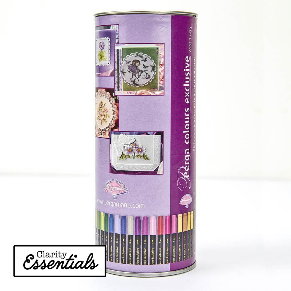 The perga colours exclusive (PCE) are markers with a water based ink. The ink can be applied to the parchment paper with or without a brush. The perga colours exclusive give you the opportunity to create beautiful projects using a relatively simple technique. Each PCE has 2 different tips: a thick and a thinner tip which makes it even easier to apply colour. The PCE's are packed in a luxury tube with no less than 30 different colours.